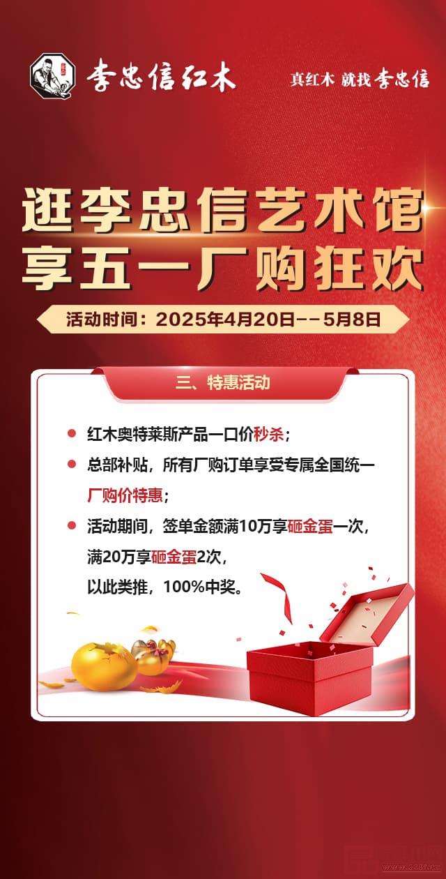 红木奥特莱斯产品一口价秒杀,限时抢购,数量有限,先到先得。总部补贴,所有厂购订单享受全国统一厂购价特惠,让您省钱又省心。活动期间,签单金额满10万享砸金蛋一次,满20万享砸金蛋2次,以此类推,100%中奖。每一次砸金蛋,都是一次惊喜的开启,精美礼品、现金红包等大奖等您来拿,让您在购物的同时,收获满满的幸运与喜悦。
