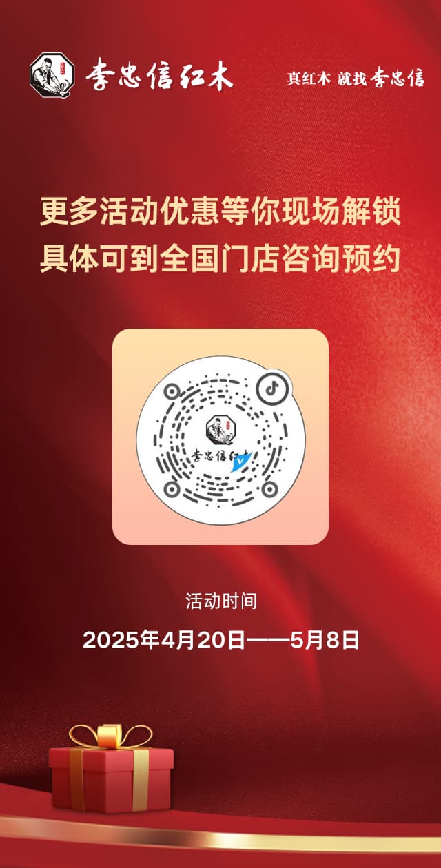 五一厂购狂欢,李忠信艺术馆与您相约。这不仅是一场购物的狂欢,更是一次文化的盛宴。活动期间,更多优惠等您现场解锁,具体详情可到全国门店咨询预约。让我们一起走进李忠信艺术馆,感受红木文化的魅力,享受厂购狂欢的惊喜,开启一段美好的红木之旅。