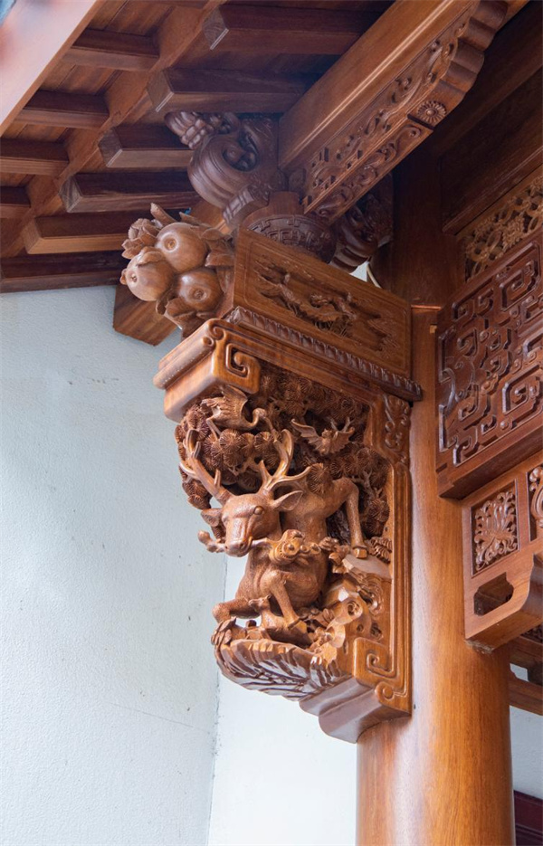 牛腿,作为古建筑中檐柱与梁枋之间的重要构件,在建筑中发挥着承重与装饰的双重作用 。其形状上大下小,犹如牛腿,故而得名 。李忠信艺术馆的牛腿雕花工艺精湛,展现出了古代工匠们的高超技艺和独特匠心 。